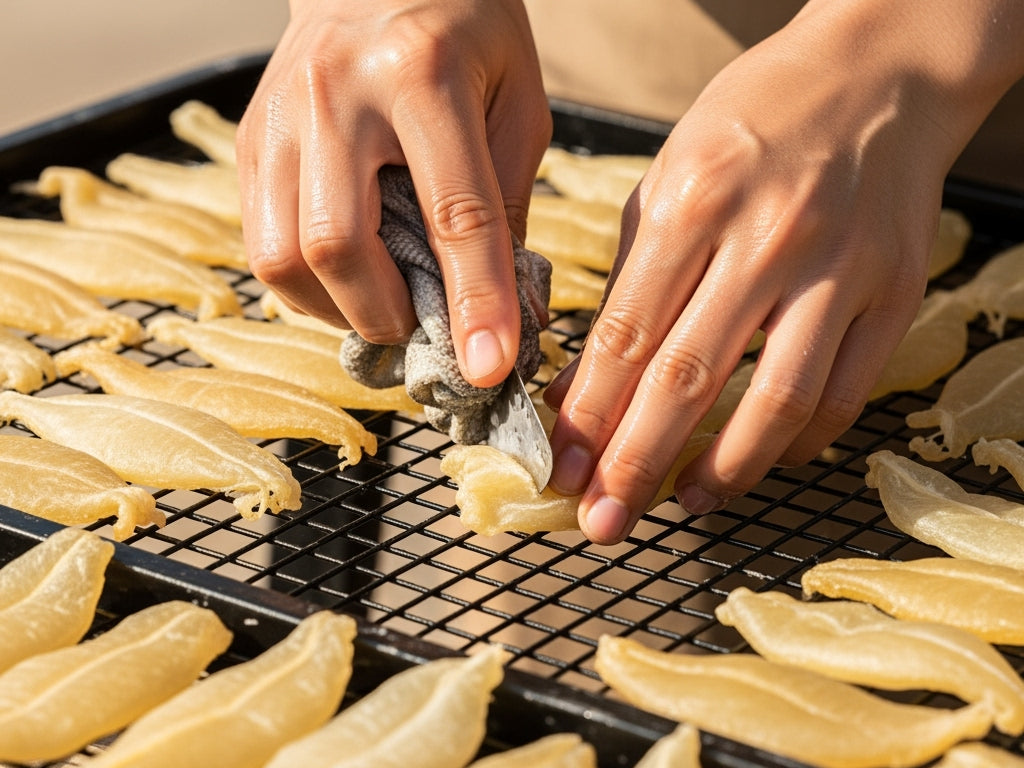 No two pieces of Fish Maw are the same and that's exactly why we cannot rely on machines. Every piece is carefully inspected, selected, and processed by skilled hands, ensuring each piece preserves its full nutritional value and texture. Our promise is simple and uncompromising; we deliver the highest quality of Fish Maw, no shortcuts, no fillers because we believe our customers deserve only the best, every time.